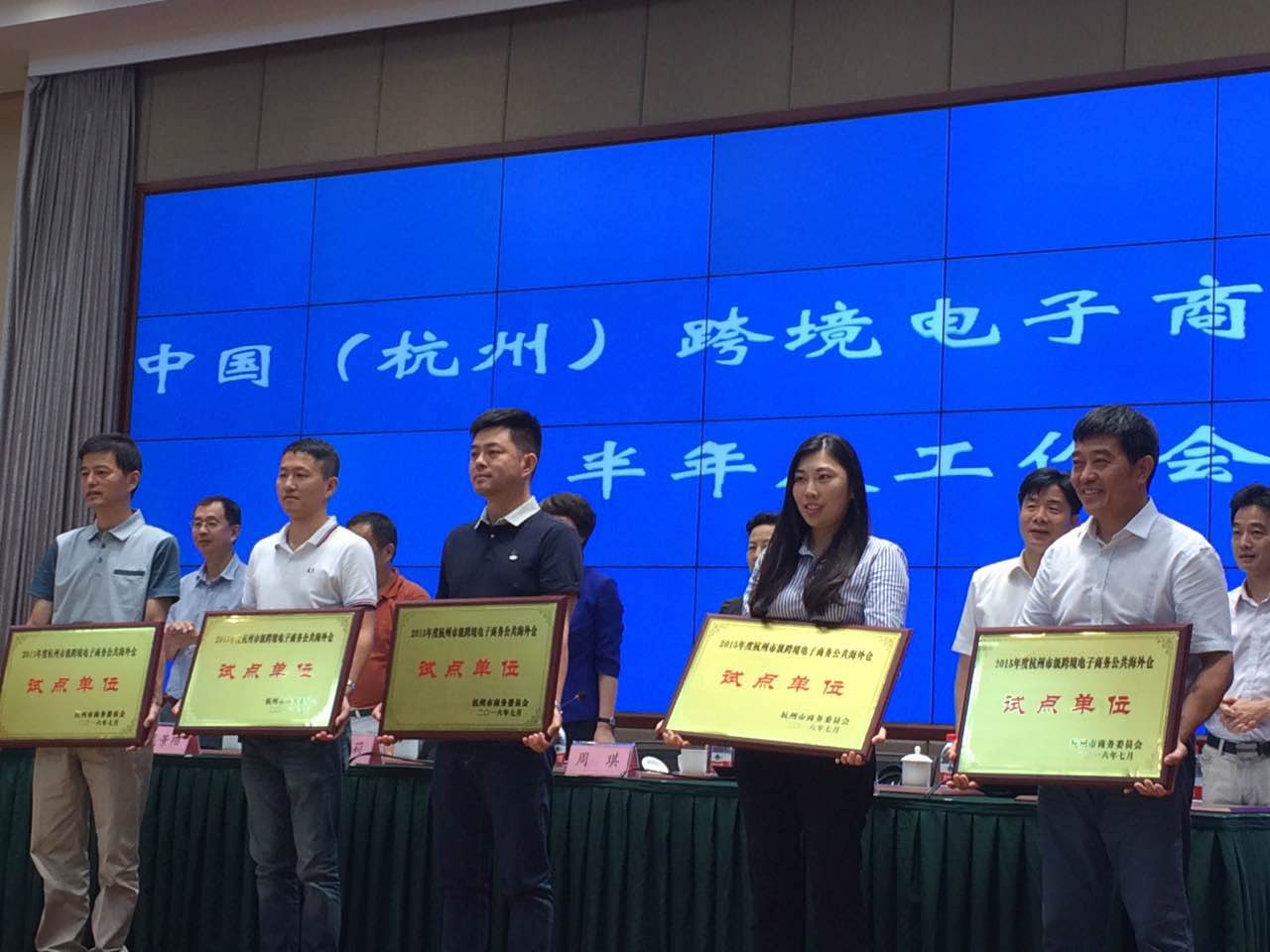 7月19日下午中國(杭州)跨境電子商務(wù)綜合試驗區半年度工作會(huì )議在杭州濱江區智慧E谷舉行,杭州市委常委佟桂莉等有關(guān)領(lǐng)導出席本次會(huì )議,杭州環(huán)宇集團有限公司(美國芝加哥倉) 、浙江點(diǎn)庫電子商務(wù)有限公司(澳洲墨爾本倉)榮獲杭州市跨境電子商務(wù)公共海外倉試點(diǎn)企業(yè)。集團董事長(cháng)徐林軍、副總經(jīng)理徐渙渙參加會(huì )議并領(lǐng)取榮譽(yù)牌。